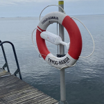 Bilden visar en livboj som hänger på en stolpe på en brygga.