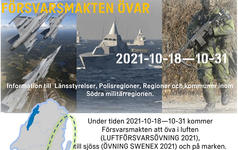 Under tiden 18/10 – 31/10 kommer Försvarsmakten att öva i luften (LUFTFÖRSVARSÖVNING 2021), till sjöss (ÖVNING SWENEX 2021) och på marken.