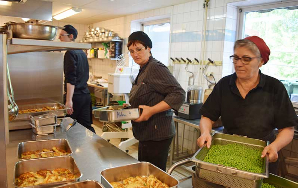 Men det är sannerligen fart även i detta kök. Arbetslaget, som består av sex personer, arbetar till synes sömlöst kring de stora trågen, ugnarna och stekhällarna. Det märks att arbetslaget vet exakt vad som behövs göras, på exakt rätt minut. Köket levererar mat till de boende på kommunens särskilda boenden, till de som har mat inom hemsjukvård och hemtjänst, och därtill lunchlådor för de pensionärer som tidigare köpt mat i matsalen men som nu vill köpa en lunchlåda vid dörren.