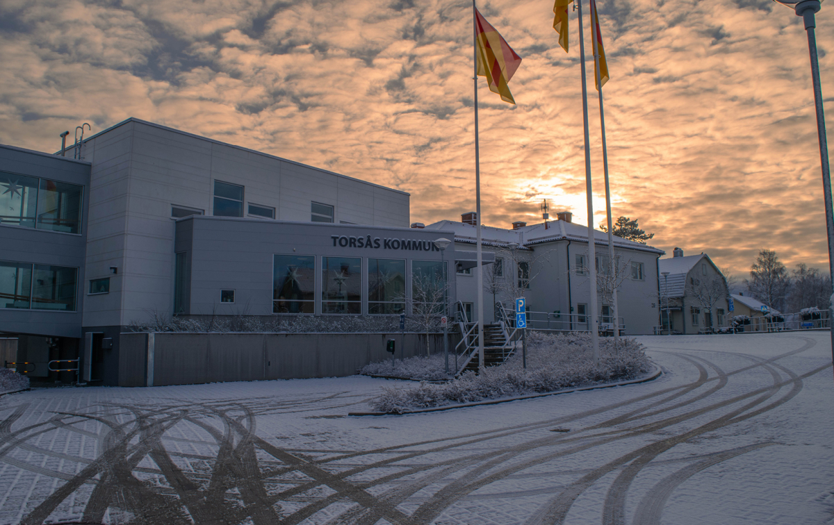 Bilden visar Torsås kommunhus med en solnedgång som färgar himlen orange. Torsås kommuns flagga vajar i vinden. På marken ligger det snö.
