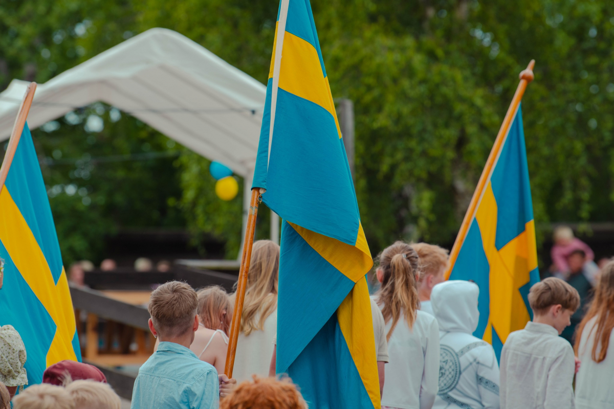 Bilden visar elever som går på led till skolavslutning. Några av eleverna bär svenska flaggan.