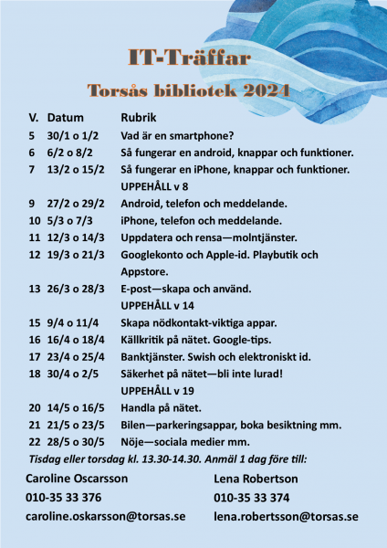 Torsås bibliotek bjuder in till IT-träffar för seniorer under våren. Det är olika teman varje vecka med inriktning på kommunikation, vardag, säkerhet och nöje.