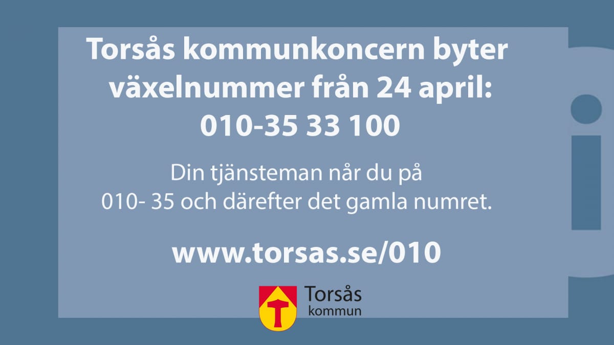 Helgen den 22-23 april byter Torsås kommunkoncern telefonnummer. Detta projekt sker i samverkan med Region Kalmar län och alla kommuner i regionen förutom Nybro och Borgholm. Torsås kommunkoncern byter telefonnummer från dagens 0486- till 010-35.