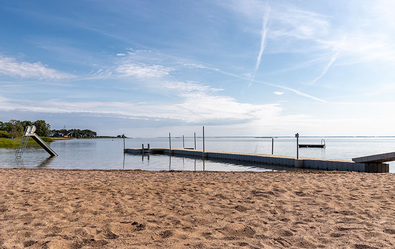 Bilden visar en tom badplats med en brygga och en rutschkana ståendes en bit ut i vattnet.