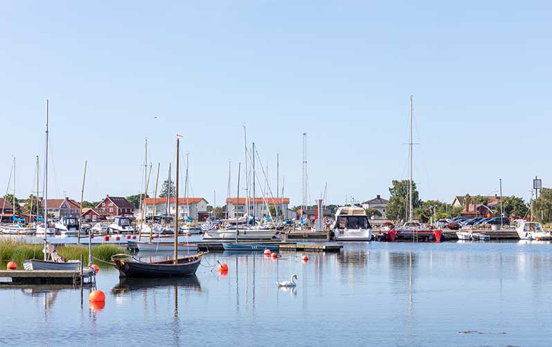 Bilden visar båthamnen i Bergkvara som är full med olika småbåtar en solig sommardag.