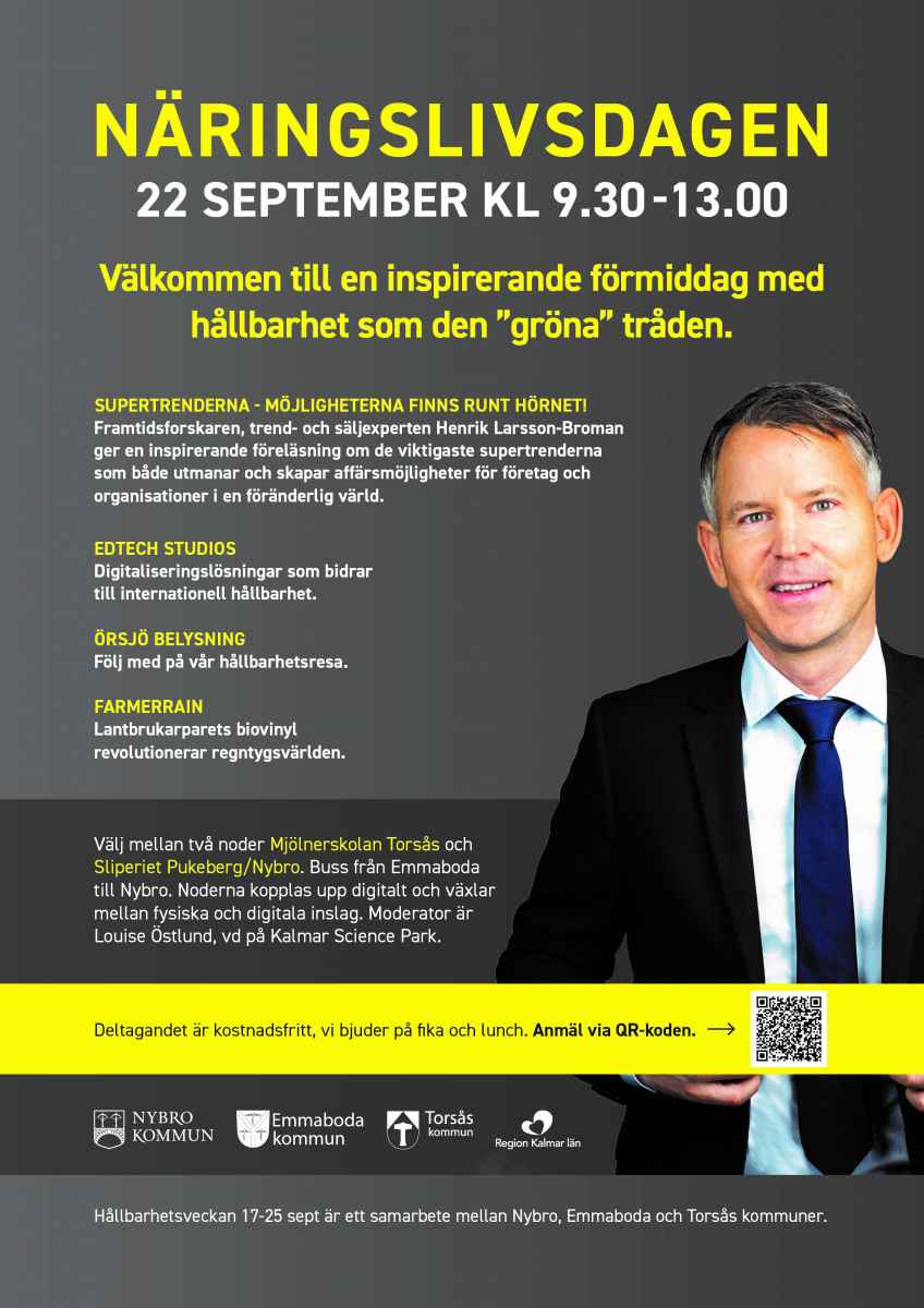 Näringslivsdagen är en del av Hållbarhetsveckan och görs i samarbete med Emmaboda kommun och Nybro kommun.