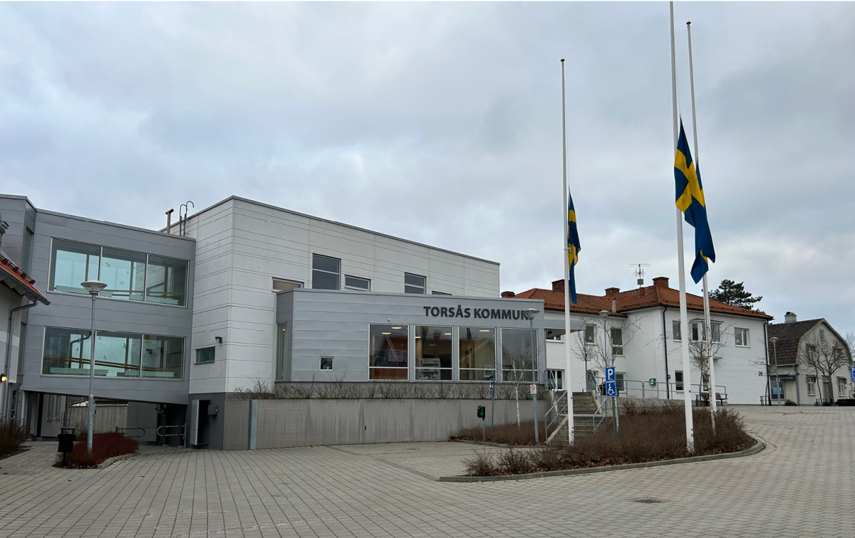 Bilden visar kommunhuset i Torsås med svenska flaggan på halv stång.