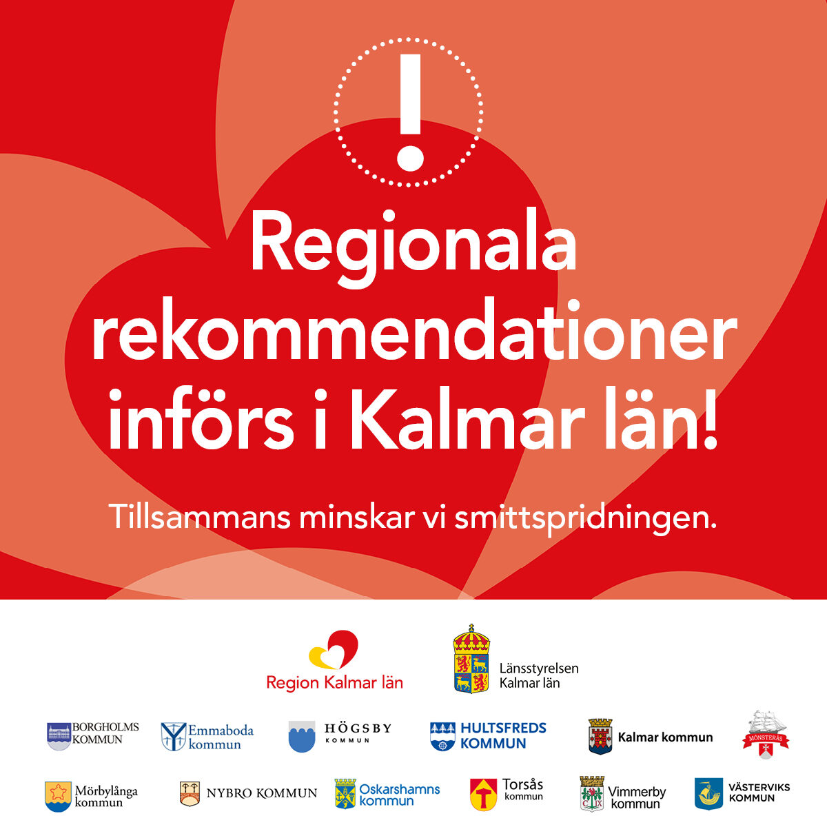 Kalmar län har just nu en hög och ökande smittspridning av covid-19. Med anledning av det kritiska läget har smittskyddsläkaren beslutat om regionala rekommendationer, som träder i kraft den 1 april. De skärpta rekommendationerna gäller alla som bor eller vistas i länet, även dig som är vaccinerad, till och med den 16 maj. De består sammanfattat av tre nya punkter: