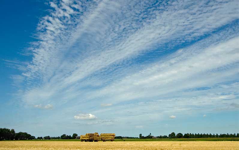 Bilden visar åkermark som nyligen skördats med blå himmel med några glesa tunna moln.