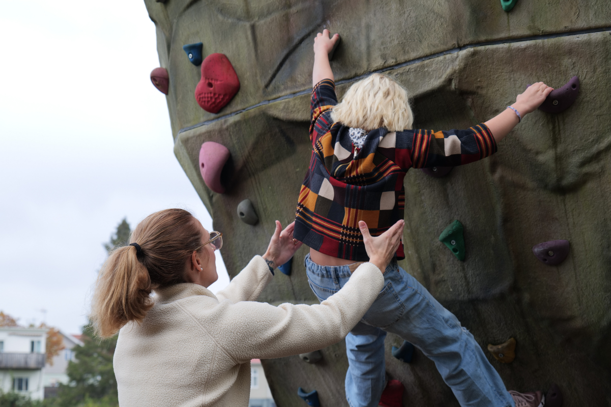 Bilden visar ett barn som klättrar på en klättervägg med en vuxen bakom som skyddar.