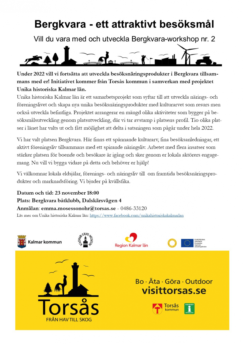 Under 2022 vill vi fortsätta att utveckla besöksnäringsprodukter i Bergkvara tillsammans med er! Initiativet kommer från Torsås kommun i samverkan med projektet Unika historiska Kalmar län. Unika historiska Kalmar län är ett samarbetsprojekt som syftar till att utveckla närings- och föreningslivet och skapa nya unika besöksnäringsprodukter, men också utveckla befintliga.
