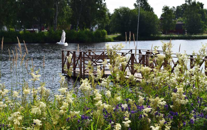 Bilden visar en brygga som går ut i en sjö. I förgrunden blomstrar blommorna.