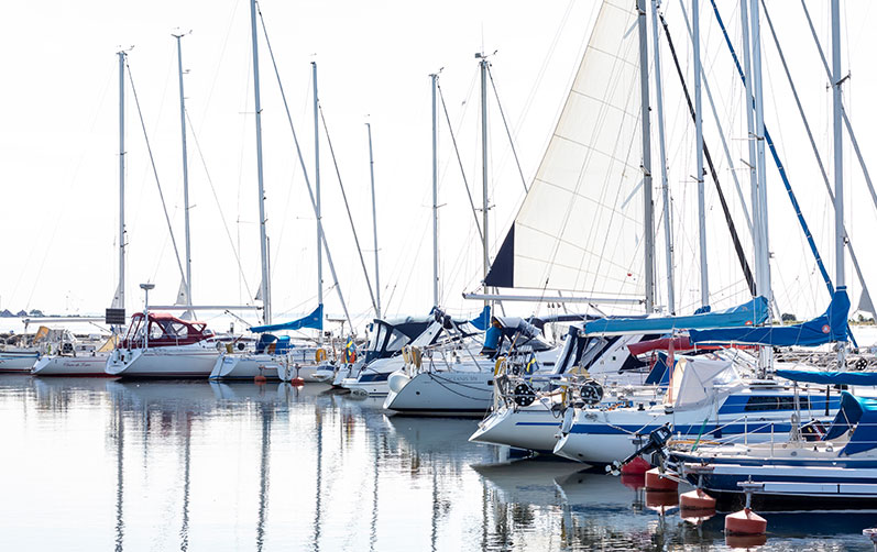 Bilden visar båtar som ligger till kaj i Bergkvara hamn med en helt vit himmel.
